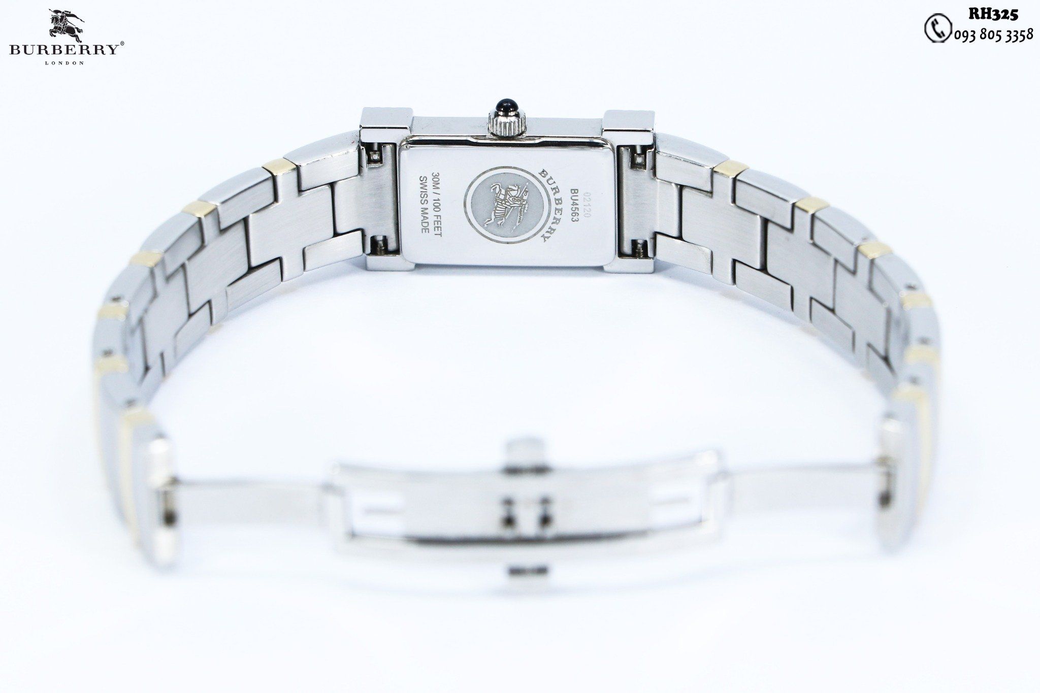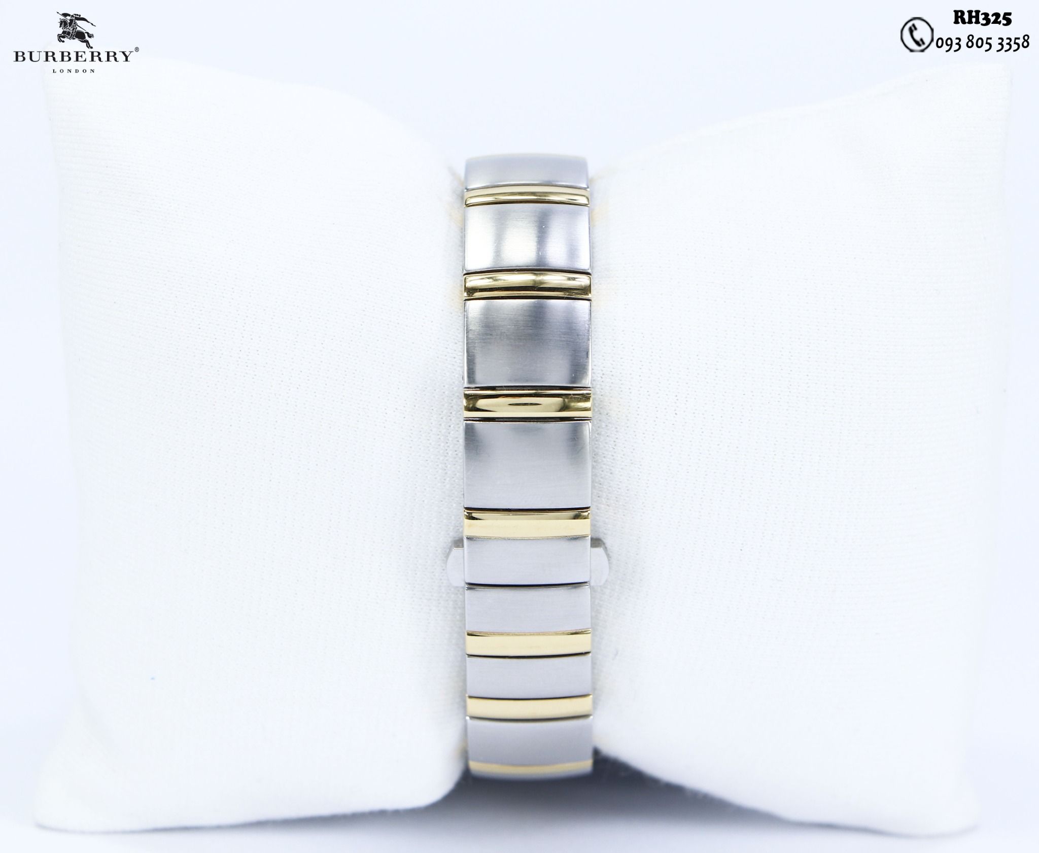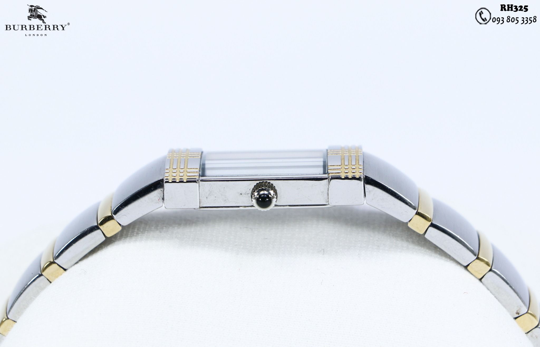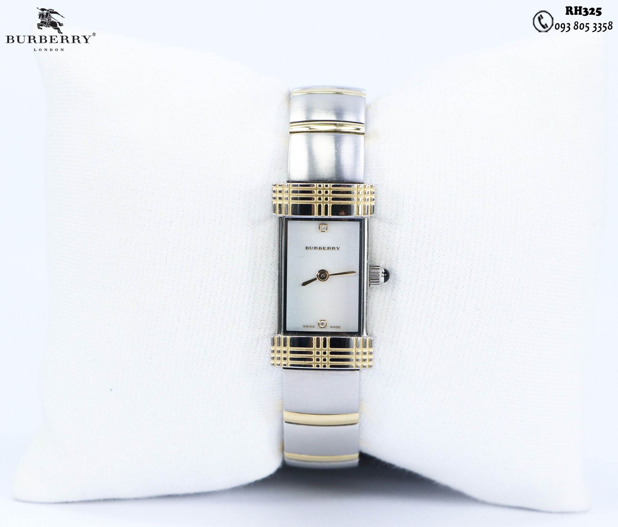 Thông tin đồng hồ BURBERRY authentic ( RH325 )Thương hiệu: BURBERRYSản xuất: SWISS MADESize mặt: 16 x28mmĐộ mới: 92%Dây còng tay rất hiếm, dáng chấtGiá: 8tr990
